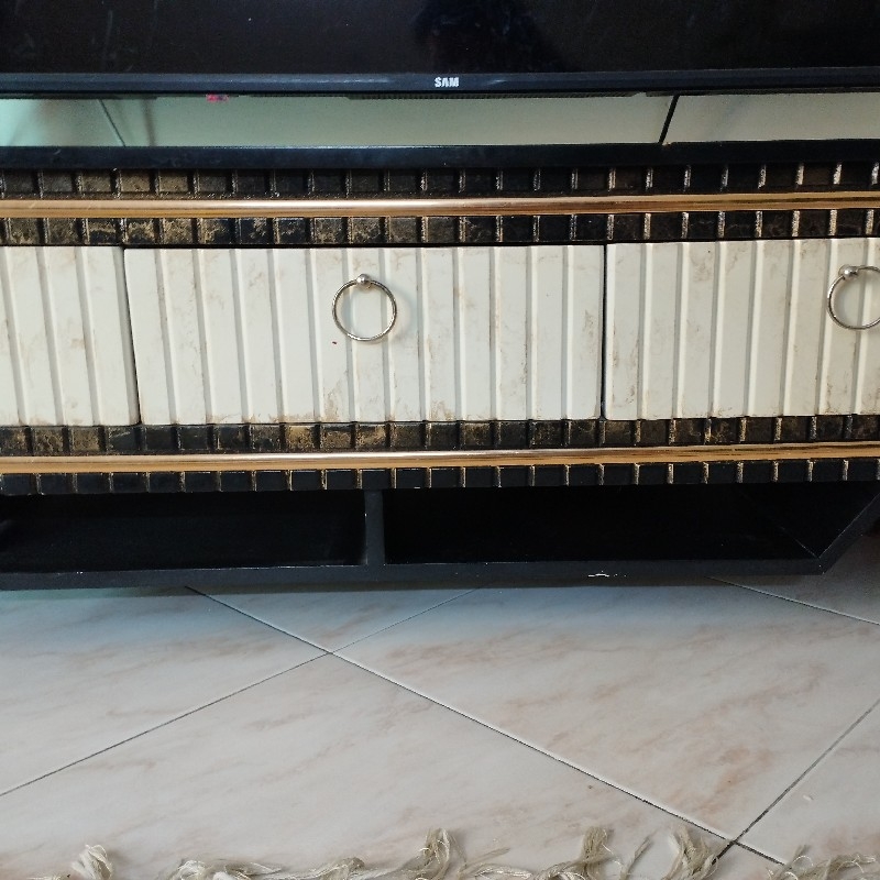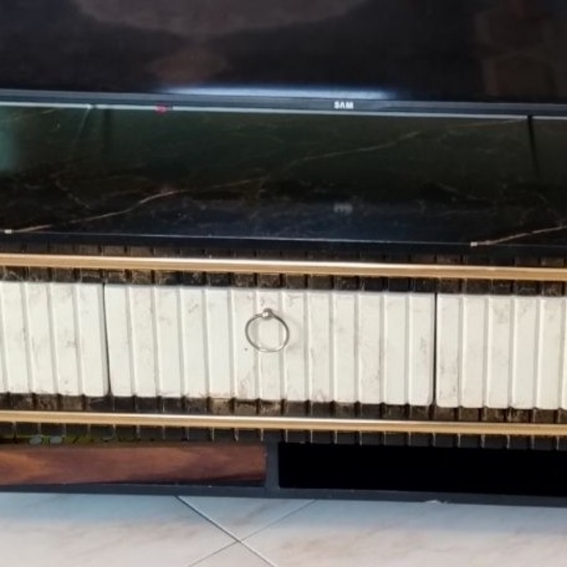 یک عدد میز تلویزیون مشکی طلایی در ابعاد ۴۰×۱۶۰ دارای ۳ کشو و ۲ قفسه به خریدار واقعی تخفیف هم داده میشه