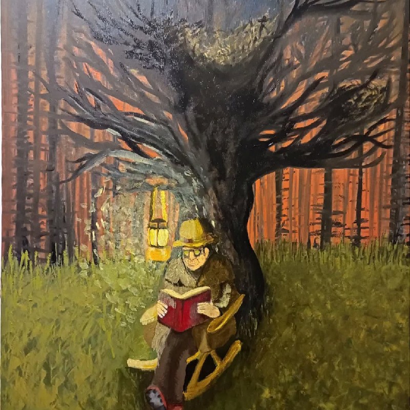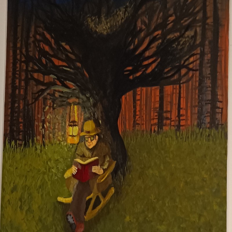 سکوت متلق، سردی آرامش بخش جنگل – مطالعه در زیر درخت به خواب رفته پاییزی به من حس گرما و امنیت میدهد چراغ.