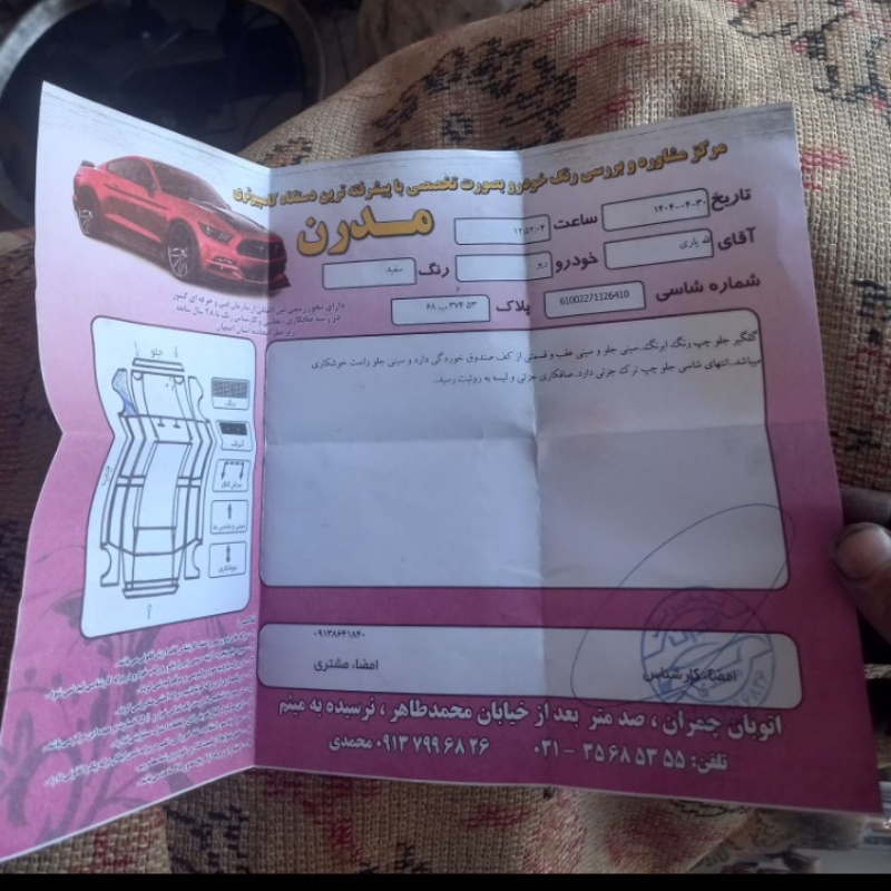 سلام شاسی سالم بدون عیب فنی مدارک کامل سند بنام گلگیر جلو سمت راننده فقط رنگ